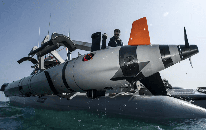 The Common Uncrewed Surface Vessel, a drone made by RTX that tows a new floating sonar system called the AQS-20, scans the bottom of the sea for mines, patrolling columns that are 100 feet wide at a time.
